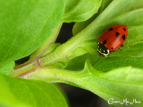 When I was a primary school kid, spotted red ladybugs represented good luck to primary school children as a ladybug was a rarity to find. The belief was the same as finding a four leaf clover. Recently within my herb garden, I found both - a ladybug and a four leaf clover! The ladybug was found curiously grazing amongst a clutter of mint basil leaves. The four leaf clover was found growing wildly in a cluster of four leaf clovers within my herb garden. I placed the four leaf clover on the palm of my hand.